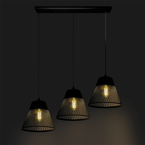 Изящные плетёные подвесные светильники барокко, выполненными из пластичного металла. Сочетание лаконичной арматуры и лёгких плафонов с вычурным основанием и фигурным навершием отлично подойдёт для помещений в стиле нео-лофт. Исполнен в конфигурации три плафона чёрного цвета, расположенных в линию на прямоугольном основании.