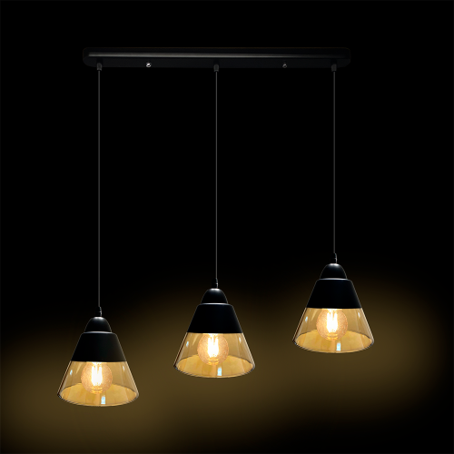 Стильный подвесной светильник с плафонами в форме усечённых конусов, выполненных из толстого прозрачного окрашенного стекла. Исполнен в конфигурации три плафона янтарного цвета, расположенных в линию на прямоугольном основании.