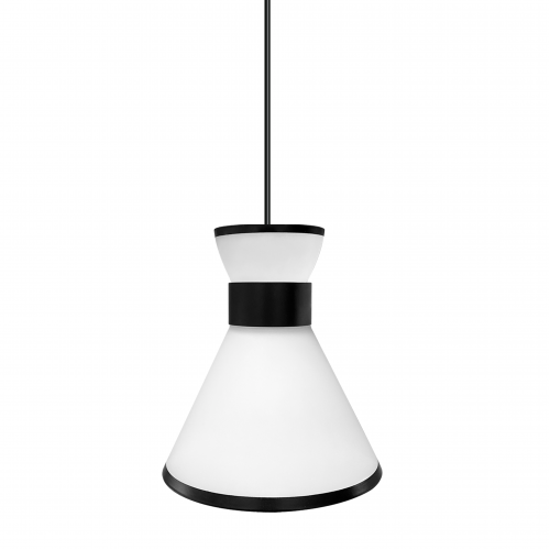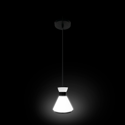 Подвесной светильник с плафонами оригинальной формы двойного усечённого конуса, выполненных из толстого полностью окрашенного стекла. Исполнен в конфигурации один плафон глубокого белого матового цвета на малом круге.