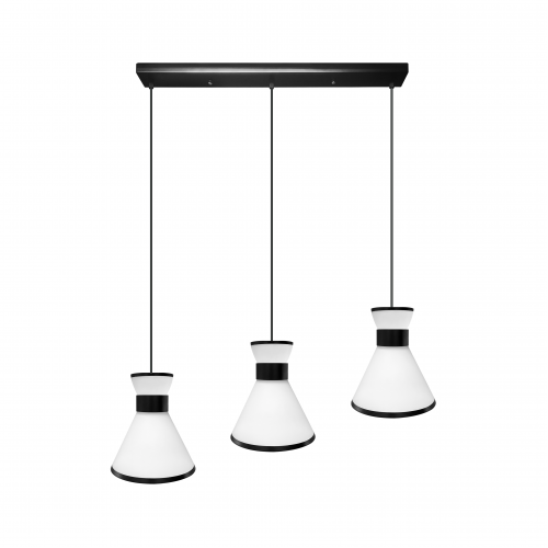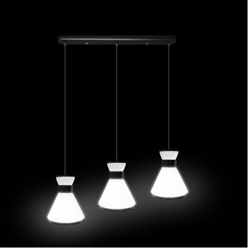 Подвесной светильник с плафонами оригинальной формы двойного усечённого конуса, выполненных из толстого полностью окрашенного стекла. Исполнен в конфигурации три плафона глубокого белого матового цвета, расположенных в линию на прямоугольном основании.