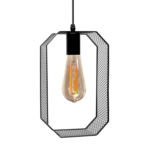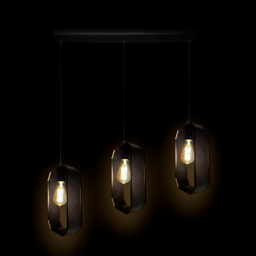 Подвесной светильник в стиле лофт с плафоном, выполненным из полосы пластичного металла, сформированной в вытянутый восьмигранник. Исполнен в конфигурации три плафона чёрного цвета, расположенных в линию на прямоугольном основании.